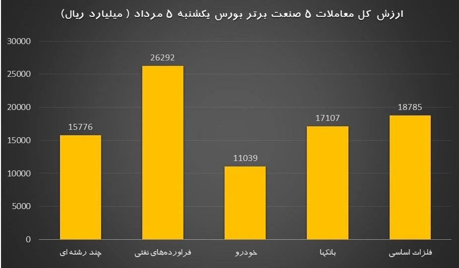 ماه گذشته ارزش معاملات خرد بازار سهام شامل معاملات در بازارهای اول، دوم، پایه، اختیار معامله و SME به رقم یک میلیون و ۳۴۰ هزار و ۱۳۳ میلیارد ریال رسید. گروه فلزات اساسی با مبادلاتی به ارزش ۱۵۹ هزار و ۸۸۹ میلیارد ریال ۱۲ درصد از ارزش کل معاملات بازار سهام را در اختیار گرفت و در جایگاه نخست ایستاد. صنعت سرمایهگذاریها نیز سهم ۱۰ درصدی را به خود اختصاص داد و در مرتبه دوم نشست. به ترتیب صنعت «بانکها و موسسات اعتباری»، «محصولات شیمایی» و «عرضه برق، گاز، بخار و آب گرم» نیز در رتبههای سوم تا پنجم قرار گرفتند.