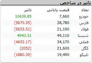 امروز نمادهای ایران خودرو و شستا بیشترین اثر افزایشی در شاخص کل بورس تهران را داشتند و نمادهای پتروشیمی خلیج فارس، فولاد مبارکه، ملی مس، گل گهر و سرمایهگذاری نفت و گاز و پتروشیمی تأمین بیشترین اثر کاهشی در شاخص بورس را داشتند.