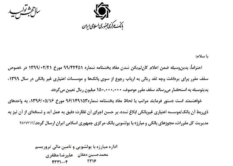 بانک مرکزی با ابلاغ بخشنامه ای به بانکها، سقف مقرر برای پرداخت وجه نقد به ارباب رجوع در سال ۱۳۹۹ را به پانزده میلیون تومان کاهش داد.