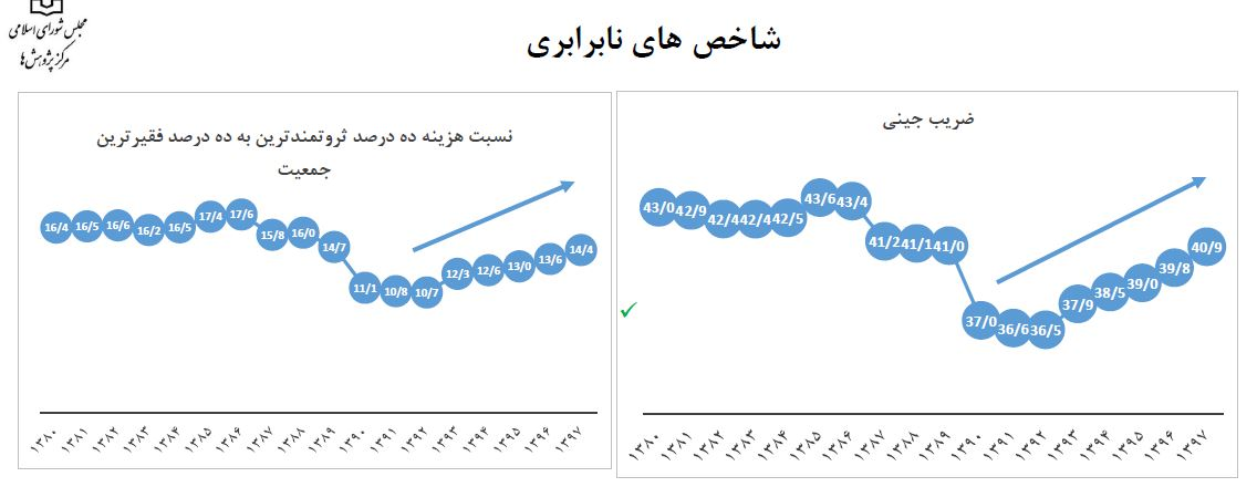 در این گزارش شاخصهای نابرابری با رسم نمودار تشریح و طی آن عنوان شده است که روند صعودی ضریب جینی و نسبت ده درصد ثروتمندترین به ده درصد فقیرترین جمعیت از سال 1392 نشان دهنده افزایش قابل توجه نابرابری و شکاف اجتماعی در نتیجه رشد اقتصادی منفی و تورم بالای اقتصاد طی این سالها بوده است.*افزایش قابل توجه نابرابری و شکاف اجتماعی در نتیجه تورم بالای اقتصاد