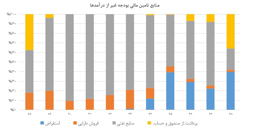 در ادامه گزارش به موضوع محل تأمین مالی بودجه از محلی غیر از درآمدی پایدار اشاره شده و عنوان شده است که طی سالهای اخیر با کاهش منابع حاصل از فروش شرکتهای دولتی جبران کسری بودجه از طریق استقراض از صندوق توسعه ملی و انتشار اوراق صورت گرفته است.