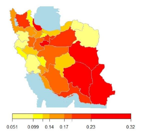 توزیع جغرافیایی فقر در استانهای کشور در سال 1397 به یک شکل نبوده و نرخ فقر بین 5 تا 32 درصد بین استانهای کشور متغیر بوده است. استانهای نیمه شرقی کشور با نرخهای فقر به مراتب بالاتری روبرو بودهاند.