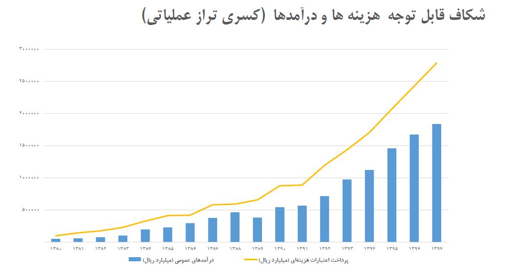 بر اساس گزارش مرکز پژوهشهای مجلس شورای اسلامی، در سال 1397 دولت به شکاف حدود 90 هزار میلیاردی هزینهها و درآمدها یا همان کسری تراز عملیاتی رسیده است.