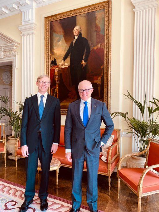 همزمان با سفر هوک به بریتاینا، وودی جانسون، سفیر آمریکا در بریتانیا، در توئیتی نوشت: «نماینده ویژه، برایان هوک، در لندن حضور دارد تا این نکته را بررسی کند که چرا ناتوانی در تمدید تحریمهای تسلیحاتی سازمان ملل علیه ایران جهان را خطرناکتر خواهد کرد.»