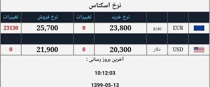افزون بر این، هر فرانک سوئیس ۴۵ هزار و ۹۲۹ ریال، کرون سوئد ۴ هزار و ۷۸۱ ریال، کرون نروژ ۴ هزار و ۶۰۷ ریال، کرون دانمارک ۶ هزار و ۶۳۷ ریال، روپیه هند ۵۶۱ ریال، درهم امارات متحده عربی ۱۱ هزار و ۴۳۷ ریال، دینار کویت ۱۳۷ هزار و ۴۳۷ ریال، یکصد روپیه پاکستان ۲۵ هزار و ۵۵ ریال، یکصد ین ژاپن ۳۹ هزار و ۶۷۲ ریال، دلار هنگ کنگ ۵ هزار و ۴۲۰ ریال، ریال عمان ۱۰۹ هزار و ۲۳۲ ریال و دلار کانادا ۳۱ هزار و ۳۳۴ ریال قیمت خورد.