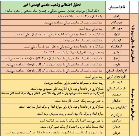 بنابر اعلام کمیته اپیدمیولوژی کووید-۱۹ منتشر شده در سایت وزارت بهداشت، در روند کشوری بیماری، هر چند موارد ابتلا و مرگ نسبتا ًبالا است، اما ثبات و تغییرات مختصر نزولی در آن دیده می شود.  روند ثبات با شدت بالای ابتلا و مرگ در شش استان (زنجان، لرستان، اردبیل، فارس، تهران و آذربایجان شرقی) و با شدت کمتر در دو استان (قم و سیستان و بلوچستان) مشاهده شد. روند صعودی یا شروع پیک در چهار استان (مازندران، اصفهان، البرز، چهارمحال و بختیاری)   و روند ثبات با تغییرات مختصر صعودی در یک استان (یزد) مشاهده شد.  به نظر می رسد سه استان (بوشهر، مرکزی و همدان) اخیرا یک پیک اپیدمی را تجربه کرده اند. در چهار استان روند نزولی (خوزستان، آذربایجان غربی، گلستان و خراسان جنوبی) و در سه استان (هرمزگان، کردستان و گیلان) تغییرات مختصر نزولی به همراه روند ثبات نسبی مشاهده شد. در هشت استان (ایلام، کرمانشاه، خراسان شمالی، سمنان، کهگیلویه و بویر احمد، کرمان، خراسان رضوی و قزوین)   ناسازگاری داده ها اجازه تحلیل درستی از وضعیت اپیدمی را نمی دهد. باید مد نظر داشت که یک استان می تواند چندین پیک منحنی را تجربه نماید.