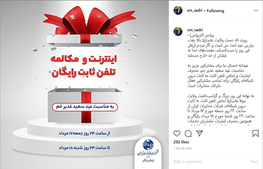 مدیرعامل شرکت مخابرات ایران با انتشار پستی در صفحه اینستاگرامی‌ اش از هدیه این شرکت برای مشترکان در روز عید غدیر خبر داد.