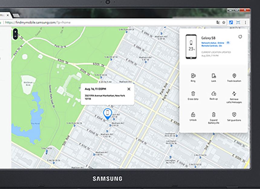 سامسونگ برای تمامی گوشیهای خود ویژگی را ارائه میدهد که با آن میتوان از راه دور به برخی تنظیمات تلفن هوشمند دسترسی داشت. برای استفاده از این ویژگی باید به سایت findmymobile.samsung.com رفت. البته برای استفاده از این قابلیت باید ارتباط اینترنت گوشی از طریق وایفای یا داده همراه، فعال باشد. در اکثر تلفنهای هوشمند با وجود قفل صفحه نیز میتوان اتصال به اینترنت را فعال کرد. با اتصال گوشی به اینترنت، از یک دستگاه دیگر مانند رایانه شخصی به سایت مذکور رفته و وارد اکانت سامسونگ خود شوید. در ادامه با انتخاب گزینه Unlock my Device میتوانید قفل تلفن خود را باز کنید.