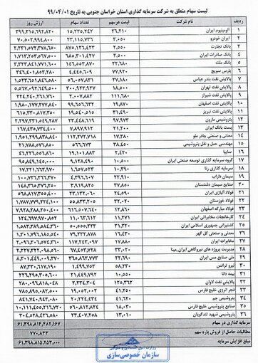 ترکیب پرتفوی سهام شرکت سرمایه‌گذاری استانی خراسان جنوبی که نخستین شرکت سرمایهگذاری استانی در بورس اوراق بهادار تهران است، مشتمل بر سهام شرکت‌های فلزات اساسی، بانکی، پالایشگاهی، خودروسازی و ... است که ارزش آنها در یکم تیرماه، مبنای سرمایه جدید شرکت بوده و افزایش قیمت سهام شرکت‌های موجود در پرتفوی شرکت تا این تاریخ به بیش از ۱۰ هزار میلیارد تومان رسیده است.
