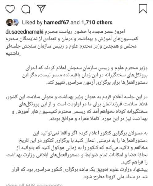 نمکی در ادامه آورده است: وزیر محترم علوم و رییس سازمان سنجش اعلام کردند که اجرای پروتکل‌های سختگیرانه در این زمان باقیمانده میسر نیست، مگر این دستورالعمل‌ها برای برگزاری آزمون سراسری تغییر کند. در این جلسه اعلام کردم به عنوان وزیر بهداشت و متولی سلامت این کشور، قطعا سلامت فرزندانمان برای ما در اولویت است و از این پروتکل‌های سختگیرانه کوتاه نخواهم آمد که ریسس محترم کمیسیون های آموزش و بهداشت نیز در این مورد کاملا همراه و موافق بودند.