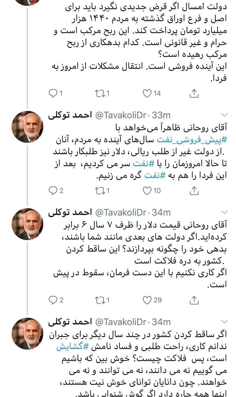 احمد توکلی نوشت: اگر ساقط کردن کشور در چند سال دیگر برای جبران ندانم کاری، راحت طلبی و فساد نامش گشایش است، پس فلاکت چیست؟ خوش بین که باشیم می گوییم نه میدانند، نه می توانند و نه میخواهند.