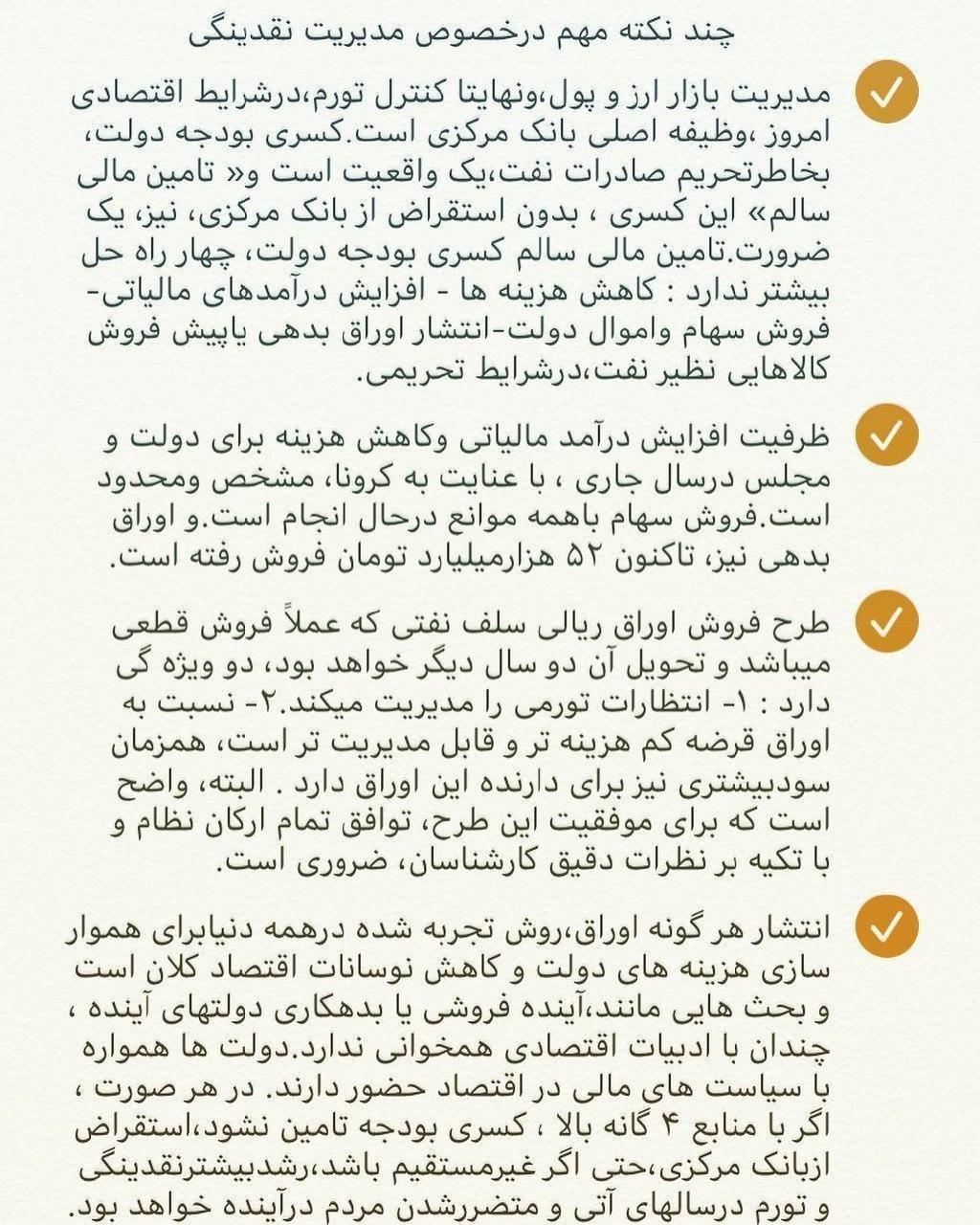 همتی در این یادداشت آورده است: ظرفیت افزایش درآمد مالیاتی وکاهش هزینه برای دولت و مجلس درسال جاری، با عنایت به کرونا، مشخص ومحدود است. فروش سهام باهمه موانع درحال انجام است؛ و اوراق بدهی نیز، تاکنون 52 هزارمیلیارد تومان فروش رفته است.