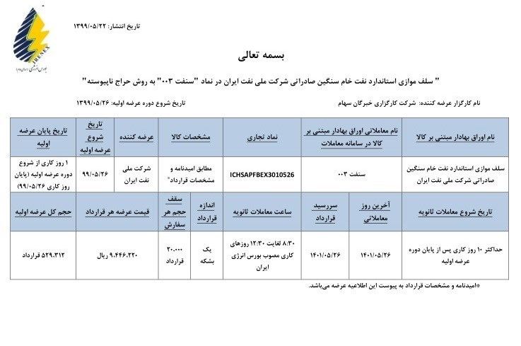 بر اساس اطلاعیه ای که در روی سایت کدال منتشر شده در اینروز 529 هزار 312 بشکه نفت خام سنگین ایران عرضه خواهد شد. قیمت هر بشکه 944 هزار و 622 تومان تعیین شده است.
