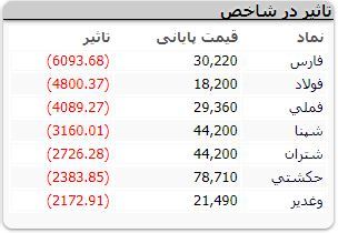 همچنین نماد پتروشیمی مارون (مارون)، سنگ آهن گهرزمین (کگهر)، پتروشیمی تندگویان (شگویا)، سهامی ذوب آهن اصفهان (ذوب)، سرمایه گذاری صبا تامین (صبا)، بانک دی (دی)، بیمه پاسارگاد (بپاس)، هلدینگ صنایع معدنی خاورمیانه (میدکو)، پتروشیمی زاگرس (زاگرس)، فولاد هرمزگان جنوب (هرمز)، گروه توسعه مالی مهر آیندگان (ومهان)، فرابورس ایران (فرابورس)، پالایش نفت لاوان (شاوان)، تولید نیروی برق دماوند (دماوند) و سرمایه گذاری میراث فرهنگی (سمگا) تاثیر منفی بر شاخص این بازار همراه بودند.