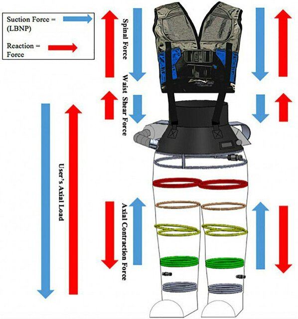 این "لباس گرانشی سیار" فشارهای منفی به پاهای فرد پوشنده وارد میکند و خون در آنجا به جریان میاندازد. اما ممکن است چرایی این مسئله برای شما سوال باشد و تعجب کنید. در پاسخ باید گفت که روی سیاره زمین، وقتی که ما ایستاده ایم، نیروی جاذبه بر ما اعمال میشود و سیستم گردش خون ما خون بیشتری را به سمت پاها میکشد و سیستم عروقی ما، چون انتظار این را دارد، تلاش میکند آن را کاهش دهد، حال چه نیروی جاذبه باشد چه نباشد.