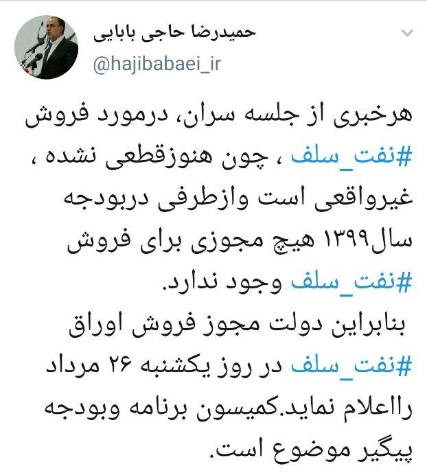 به گزارش سایت طلا ، حمیدرضا حاجی بابایی رئیس کمیسیون برنامه و بودجه مجلس در صفحه شخصی خود نوشت: هرخبری از جلسه سران، درمورد فروش نفت سلف، چون هنوزقطعی نشده، غیرواقعی است و از طرفی در بودجه سال۱۳۹۹ هیچ مجوزی برای فروش نفت سلف وجود ندارد.