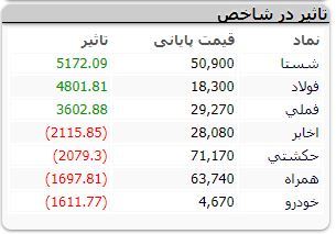 امروز نماد شستا، فولاد مبارکه و ملی مس به ترتیب بیشترین اثر افزایش در شاخص کل بورس را داشتند. همچنین نمادهای مخابرات، کشتیرانی، همراه اول و ایرانخودرو به ترتیب بیشترین اثر کاهشی در شاخص بورس را بازی کردند.