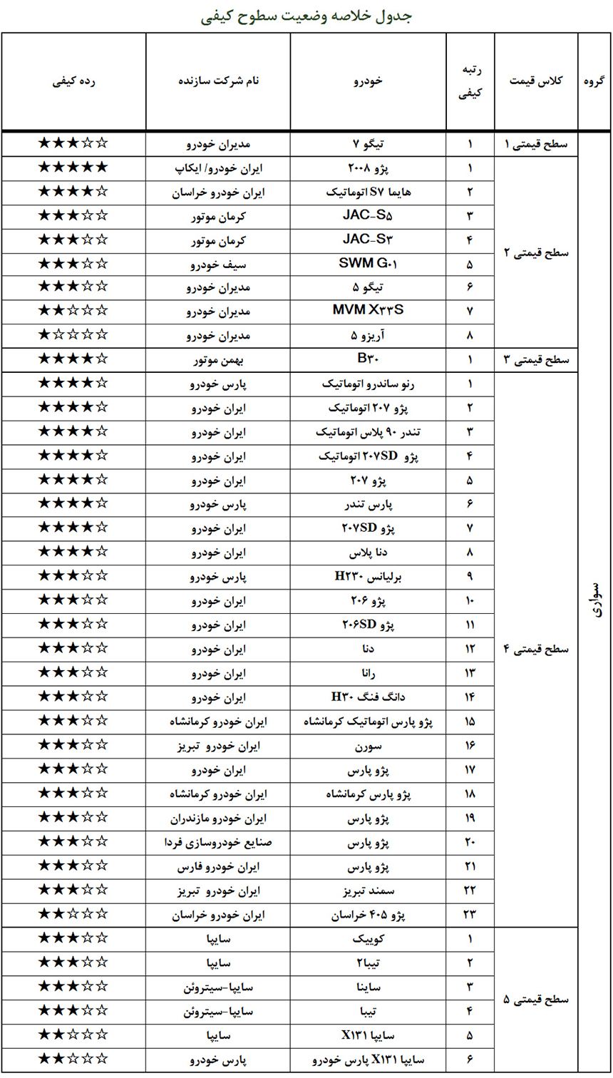در این لیست، خودروهای سورن ایران خودرو تبریز، پژو پارس کرمانشاه ایران خودرو کرمانشاه، پژو پارس ایران خودرو فارس، پژو پارس ایران خودرو مازندران، پژو پارس صنایع خودروسازی فردا همگی 3 ستاره کیفی را از آن خود کردند.