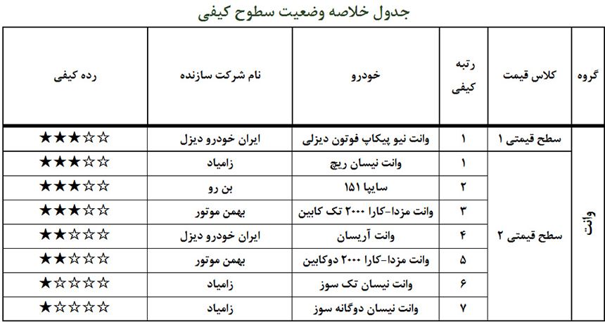 بر اساس آخرین گزارش ارزشیابی کیفی انجام شده در تیرماه امسال، در گروه خودروهای سبک 10 خودروی سواری توانستند چهار ستاره کیفی به دست آورند و همچنین 28 خودروی سبک سواری و وانت 3 ستاره کیفی به خود اختصاص دادند .
