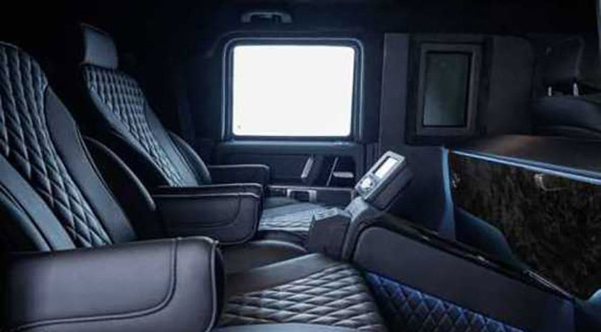 صندلیهای کاپیتانی مجهز به گرمکن و ماساژور، چرم بسیار باکیفیت یا آلکانتارا (به انتخاب مشتری) برای پوشش قسمتهای مختلف کابین، شیشههای ضد گلوله، پارتیشن فعال بین صندلی ردیف راننده و صندلی عقب که یک تلویزیون ۴K روی آن نصب شده، سیستم صوتی حرفهای با قابلیت سینمای خانگی، دکمههای کنترلی کامل سیستم صوتی/تصویری برای سرنشین عقب و ... تنها بخشی از امکانات این لیموزین جذاب و جان سخت لوکس است.