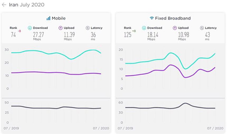 اینترنت موبایل ایران در ماه ژانویه سال ۲۰۲۰ با متوسط سرعت دانلود ۲۷.۵۳ مگابیتبرثانیه در رتبه ۷۰ قرار داشت، در بخش اینترنت پهنباند ثابت نیز ایران با متوسط سرعت دانلود ۱۸.۴۱ مگابیتبرثانیه، جایگاه ۱۲۲ جهانی را کسب کرده بود. این در حالی است که تا ماه جولای سال جاری، متوسط سرعت دانلود اینترنت موبایل در ایران ۲۹.۸۷ مگابیتبرثانیه و متوسط سرعت آپلود اینترنت موبایل، ۱۱.۸۵ مگابیتبرثانیه است که رتبه ایران را به ۷۴ از میان ۱۳۸ کشور رسانده و در مقایسه با رتبه ۷۰ در ژانویه سال جاری میلادی، حاکی از آن است که چهار رتبه و نسبت به ماه ژوئن که ایران در رتبه ۶۶ قرار داشت، هشت رتبهای پایین تر آمده است.