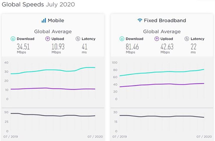 طبق آخرین آمار منتشرشده تا ماه جولای ۲۰۲۰، متوسط جهانی سرعت دانلود اینترنت موبایل، ۳۴.۵۱ مگابیتبرثانیه و متوسط جهانی سرعت آپلود اینترنت موبایل، ۱۰.۹۳ مگابیتبرثانیه است. همچنین در حوزه اینترنت ثابت، متوسط جهانی سرعت دانلود، ۸۱.۴۶ مگابیتبرثانیه و متوسط جهانی سرعت آپلود ۴۲.۶۳ مگابیتبرثانیه است.