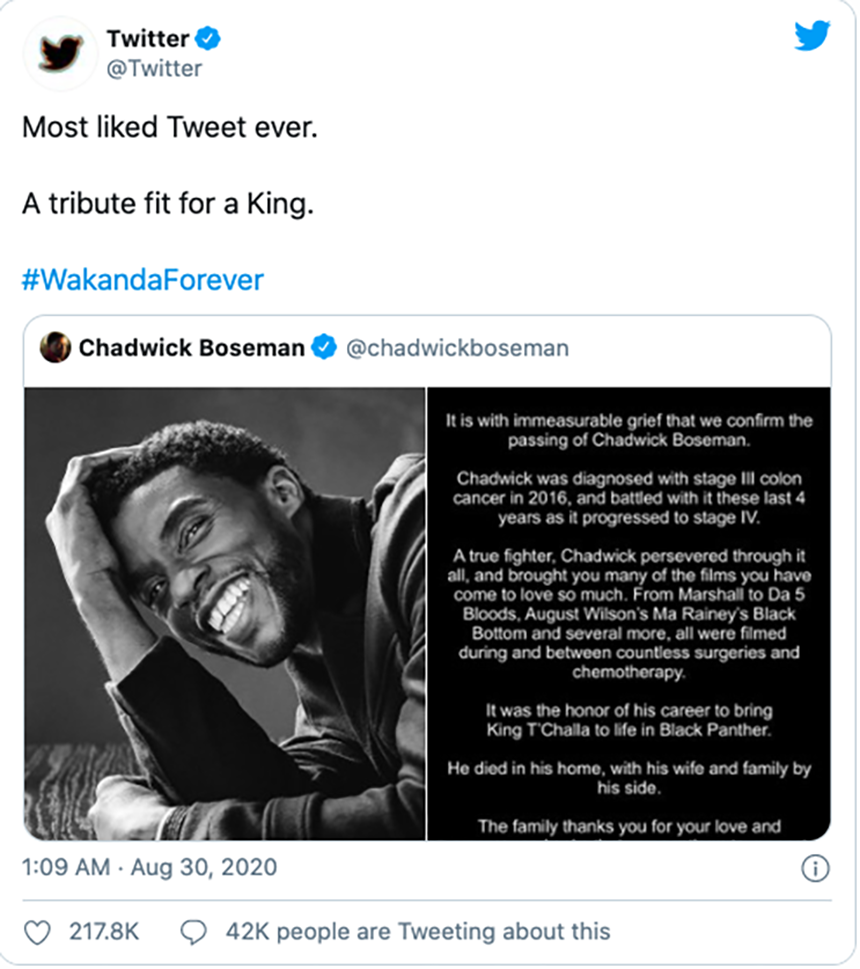 توییتی که خبر درگذشت این بازیگر را اعلام کرد رکورددار دریافت بیشترین تعداد لایک در تاریخ توییتر شد.