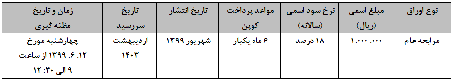 گفتنی است، این اوراق از نوع مرابحه عام، با مبلغ اسمی یک میلیون ریال و نرخ سود اسمی سالانه ۱۸ درصد منتشر شده و بر اساس قوانین و مقررات، مواعد پرداخت کوپن نیز هر شش ماه یکبار، خواهد بود.
