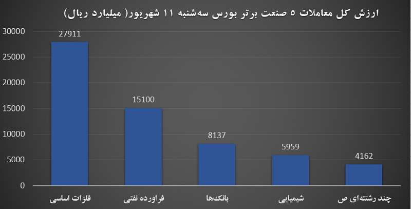 همچنین نماد سنگ آهن گهرزمین (کگهر)، پلیمر آریا ساسول (آریا)، پتروشیمی تندگویان (شگویا)، سهامی ذوب آهن اصفهان (ذوب)، پتروشیمی زاگرس (زاگرس)، فولاد هرمز جنوب (هرمز)، بانک دی (دی)، شرکت آهن و فولاد ارفع (ارفع)، کشت و صنعت شهداب ناب خراسان (غشهداب)، گروه توسعه مالی مهر آیندگان (ومهان)، فرابورس ایران (فرابورس)، تولید نیروی برق دماوند (دماوند) با تاثیر منفی بر شاخص این بازار همراه بودند.