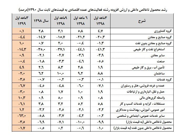 طبق این گزارش در فصل بهار ١٣٩٩ رشته فعالیتهای گروه کشاورزی ٠,١، گروه صنایع و معادن ٤.٤ - و گروه خدمات ٣.٥- درصد نسبت به فصل بهار سال ١٣٩٨، رشد داشته است.