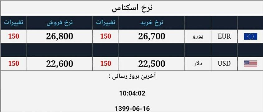 قیمت یورو نیز برای فروش در صرافی ملی 26800تومان اعلام شده است؛ قیمت خرید یورو نیز در این صرافیها 26700 تومان است.