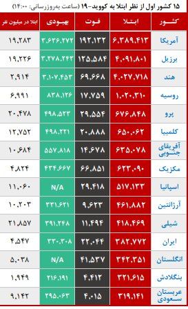همچنین ۱۵ کشور اول از نظر ابتلا به کووید-۱۹ در جدول زیر مشخص شده‌اند. باید توجه کرد که کشورهای آمریکا، برزیل و هند در رتبه اول تا سوم ابتلا به کرونا قرار دارند. کشورمان نیز در جایگاه دوازدهم از نظر میزان ابتلا به کرونا قرار دارد.