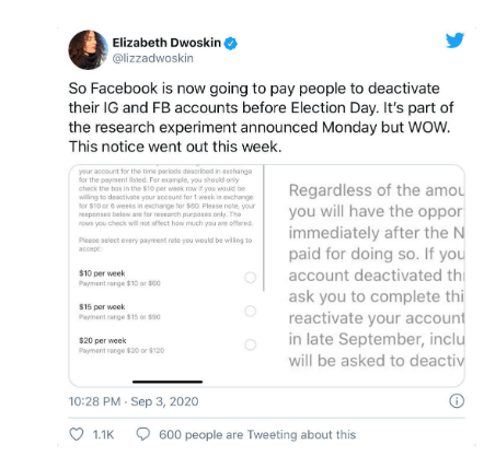 بنابر گزارش فاکس نیوز، «الیزابت دوسکین» خبرنگار واشنگتن با انتشار اسکرین شات هایی این امر را فاش کرد. به نظر می رسد این اقدام فیس بوک بخشی از یک پروژه تحقیقاتی می باشد که برای درک بهتر تاثیر این شبکه اجتماعی و اینستاگرام بر روندهای کلیدی سیاسی و رفتاری طی انتخابات ۲۰۲۰ ریاست جمهوری آمریکا انجام می شود.
