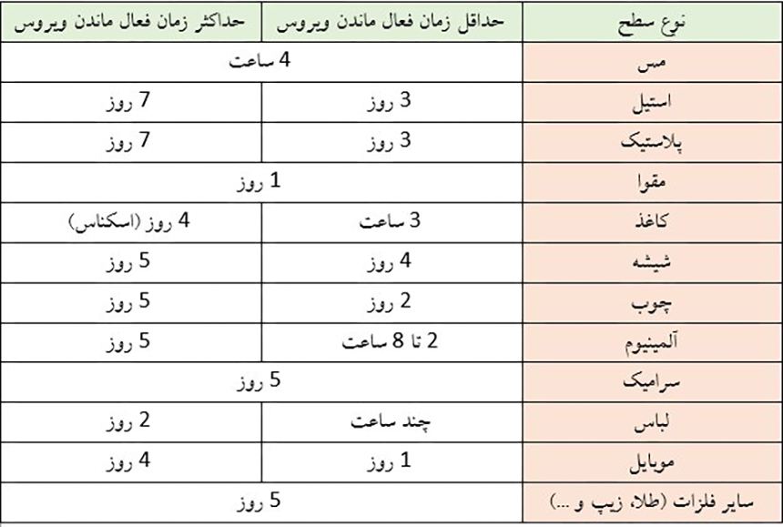 وی افزود: بر اساس اطلاعات موجود از سایتها و مراجع معتبر، خصوصاً دو مقاله مهم چاپ شده در مجلات پزشکی نیوانگلند و لنسنت، طول عمر ویروس بر روی برخی سطوح مختلف را استخراج کردیم که آن را در قالب جدول نشان دادیم.