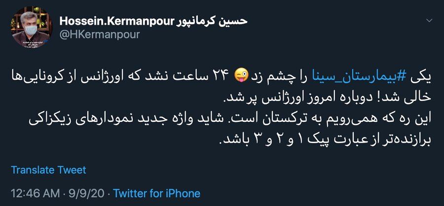 در توییت دکتر حسین کرمانپور آمده است: «یکی بیمارستان سینا را چشم زد؛ ۲۴ ساعت نشد که اورژانس از کروناییها خالی شد! دوباره امروز اورژانس پر شد.