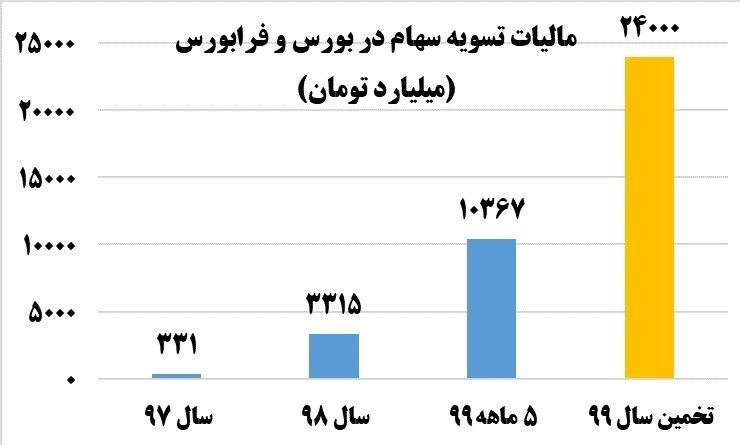 درآمد دولت از محل مالیات بر نقل و انتقال سهام چنان افزایش یافت که در 5 ماه نخست سال جاری به چندین برابر کل رقم پیش بینی شده در قانون بودجه سال جاری رسید. مطابق گزارش شرکت سپرده گذاری مرکزی اوراق بهادار و تسویه وجوه (سمات)، رقم درآمد حاصل از مالیات بر نقل و انتقال سهام در 5 ماه نخست سال جاری معادل 10 هزار و 367 میلیارد تومان بوده است. این در حالی است که رقم مالیات بر نقل و انتقال سهام در کل سال 97 و 98 به ترتیب معادل 330 و 3314 میلیارد تومان بوده است.