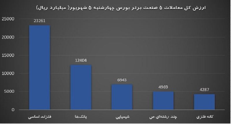 همچنین نماد هلدینگ صنایع معدنی خاورمیانه (میدکو)، پتروشیمی تندگویان (شگویا)، سهامی ذوب آهن اصفهان (ذوب)، بانک دی (دی)، صنایع ماشین های اداری ایران (مادیرا)، مدیریت انرژی تابان هور (وهور)، فرابورس ایران (فرابورس)، شرکت آهن و فولاد ارفع (ارفع)، توسعه و عمران استان کرمان (کرمان)، موسسه اعتباری ملل (وملل)، فولاد هرمز جنوب (هرمز)، گروه توسعه مالی مهر آیندگان (ومهان)، ویتانا (غویتا)، سنگ آهن گهرزمین (کگهر) و بیمه کوثر (کوثر) با تاثیر منفی بر شاخص این بازار همراه بودند.