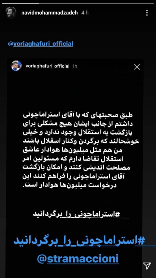 به گزارش سایت طلا ،دیروز صبح وریا غفوری در واکنش به بازگشت استراماچونی در حساب کاربری اینستاگرامش استوری منتشر کرد. در همین رابطه نوید محمدزاده بازیگر برجسته سینمای ایران که یکی از هواداران پروپا قرص استقلال است، این استوری کاپیتان استقلال را در حساب رسمی اینستاگرامش باز نشر داد تا از بازگشت این مربی برجسته ایتالیایی حمایت کند.