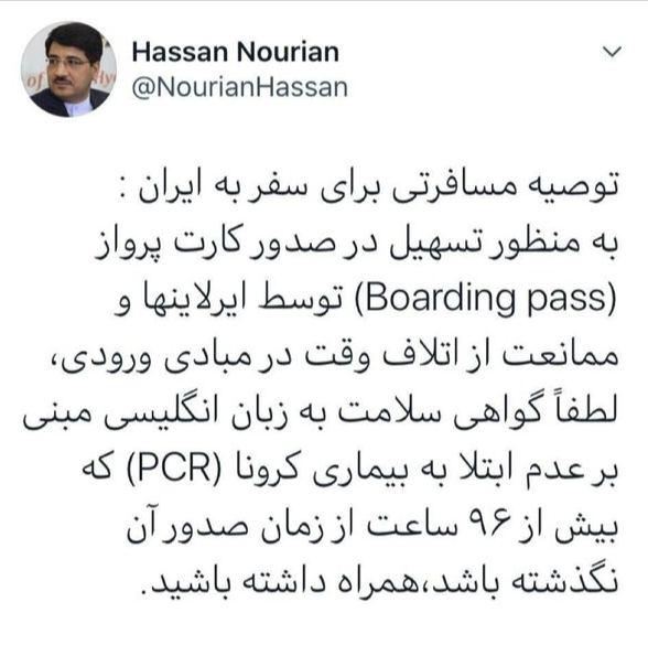 به گزارش سایت طلا ، رئیس اداره گذرنامه و روادید وزارت خارجه در صفحه توییتر خود در این ارتباط خطاب به همه مسافران ورودی به کشور نوشت : به منظور تسهیل در صدور کارت پرواز ( Boarding Pass) توسط ایرلاین ها و ممانعت از اتلاف وقت در مبادی ورود، لطفا گواهی سلامت به زبان انگلیسی مبنی بر عدم ابتلا به بیماری کرونا«PCR» که بیش از ۹۶ ساعت از زمان صدور آن نگذشته باشد، همراه داشته باشید .