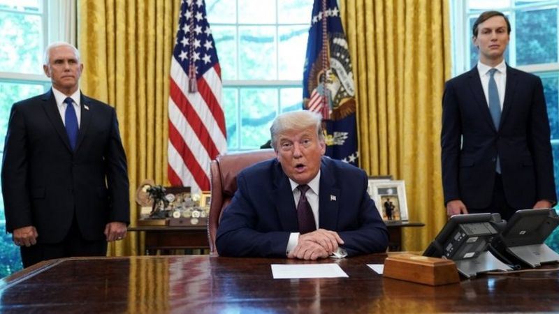 از راست جرد کوشنر مشاور ارشد و داماد ترامپ، دونالد ترامپ و مایک پنس معاون اول رئیس جمهور آمریکا هنگام اعلام خبر برقراری روابط اسرائیل و بحرین