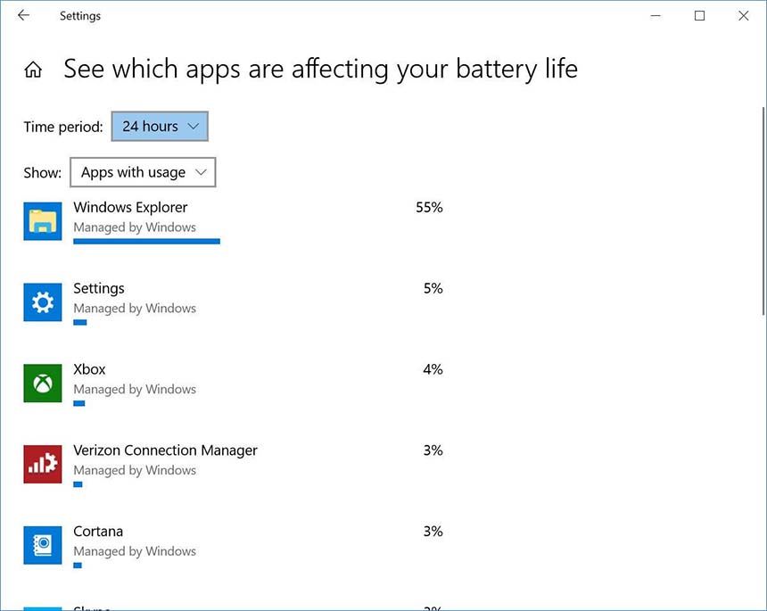 فعالیت تعداد بالای برنامهها بر روی سیستم باعث میشود که باطری لپ تاپ سریعا خالی شود و در نتیجه کاربر نمیتواند از تمامی قدرت لپ تاپ خود استفاده کند. در سیستم عامل ویندوز کاربران میتوانند با مراجعه به بخش تنظیمات برنامهها یا Settings App فرایند کارکرد نرم افزارها را مدیریت کنند. افراد برای دسترسی به بخش مورد نظر میتوانند به راحتی در بخش جستوجو ویندوز جمله "see which apps are affecting your battery life" را تایپ کنند.