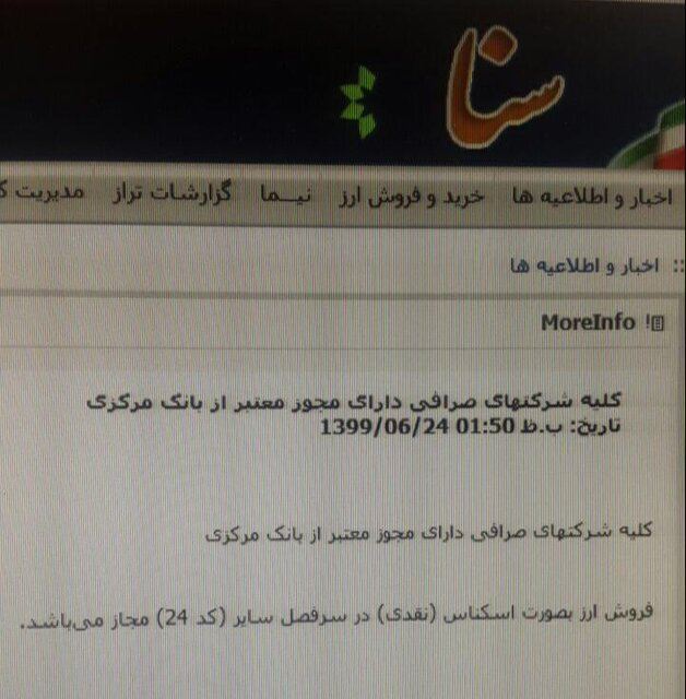 سرانجام، امروز کانون صرافان ایرانیان اعلام کرد که بانک مرکزی چند روز پیش، فروش اسکناس تا اطلاع ثانوی از طریق سیستم سنا را حذف و فروش ۲۰۰۰ یورو و معادل آن به هر دارنده کارت ملی در سال را منتفی کرد اما طبق اعلام این کانون، امروز بانک مرکزی این تصمیم خود را منتفی کرده و محدودیت خرید و فروش توسط صرافیها حذف شده و به روال سابق خود بازگشته است.