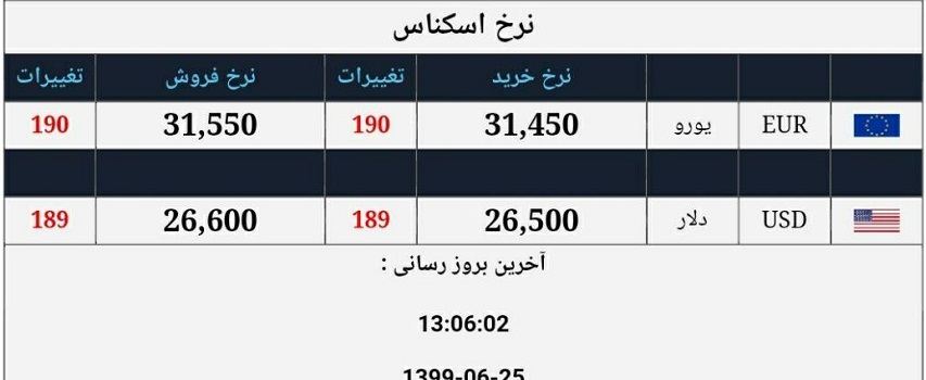 قیمت یورو نیز برای فروش در صرافی ملی 31550 تومان اعلام شده است؛ قیمت خرید یورو نیز در این صرافیها 31450تومان است.