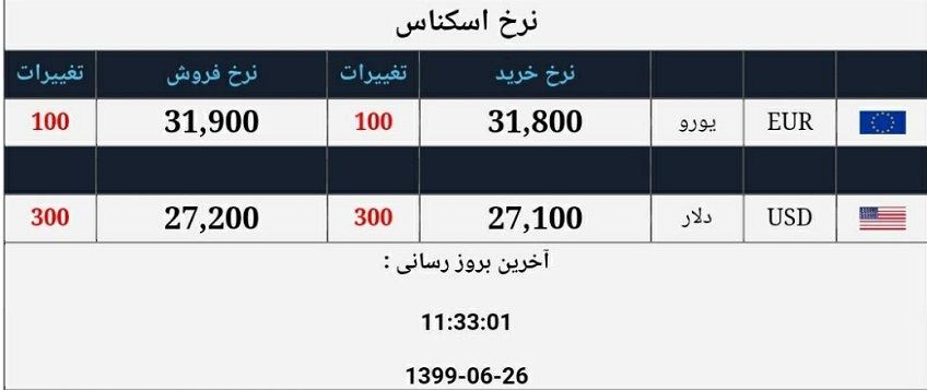 قیمت یورو نیز برای فروش در صرافی ملی 31900 تومان اعلام شده است؛ قیمت خرید یورو نیز در این صرافیها 31800 تومان است.