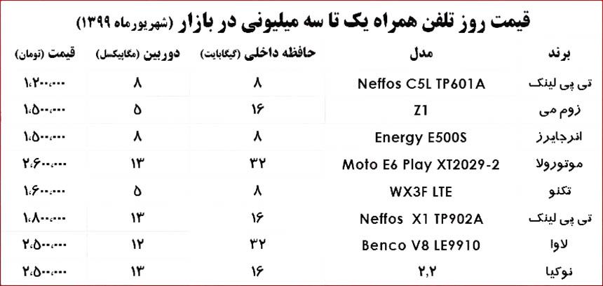 گوشی های بین 1 تا 3 میلیون تومان به شرح جدول زیر است