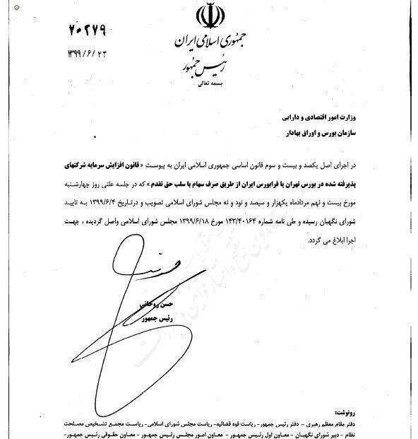 در این نامه آمده است: در اجرای اصل یکصد و بیست و سوم قانون اساسی جمهوری اسلامی ایران به پیوست « قانون افزایش سرمایه شرکتهای پذیرفته شده در بورس تهران با فرابورس ایران از طریق صرف سهام با سلب حق تقدم، که در جلسه علنی روز چهارشنبه مورخ بیست و نهم مردادماه یکهزار و سیصد و نود و نه مجلس شورای اسلامی تصویب و در تاریخ ۱۳۹۹/۶/۴ به تایید شورای نگهبان رسیده و طی نامه شماره ۱۶۴۰۱۴۳/۴ مورخ ۱۳۹۹/۶/۱۸ مجلس شورای اسلامی واصل گردیده و جهت اجرا ابلاغ می گردد.
