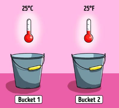 ۲ - سکه در سطل یکم. در دمای ۲۵ درجه سانتیگراد آب مایع است، در حالی که در ۲۵ درجه فارنهایت به یخ تبدیل میشود.