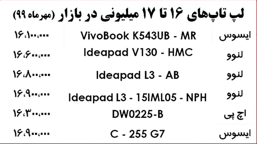 آنچه در زیر می آید قیمت انواع لپ تاپ ۱۶ تا ۱۷میلیونی در سطح بازار تهران است.