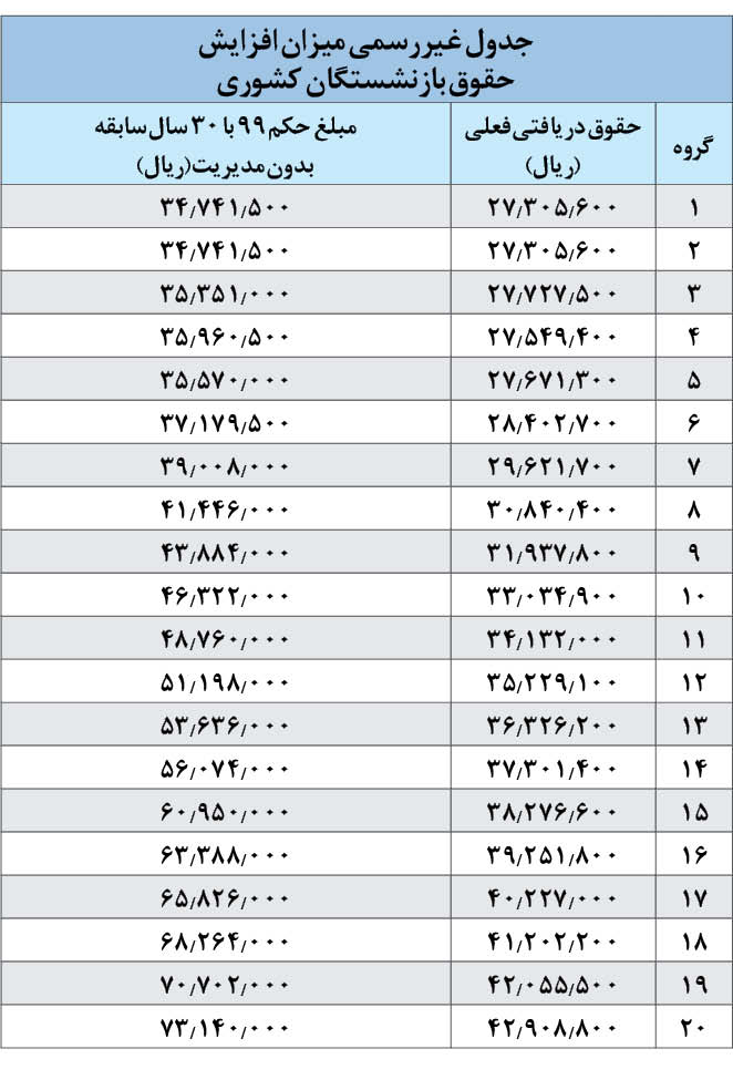 بازنشستگان با ۳۰ سال سابقه که حداقل ۲ سال سابقه مدیریت داشته باشند، حدود ۲۵۰ تا ۳۵۰ هزار تومان افزایش حقوق بیشتری خواهند داشت. ملاک مدیریت، داشتن حداقل ۲ سال مدیریت یا معاونت است.
