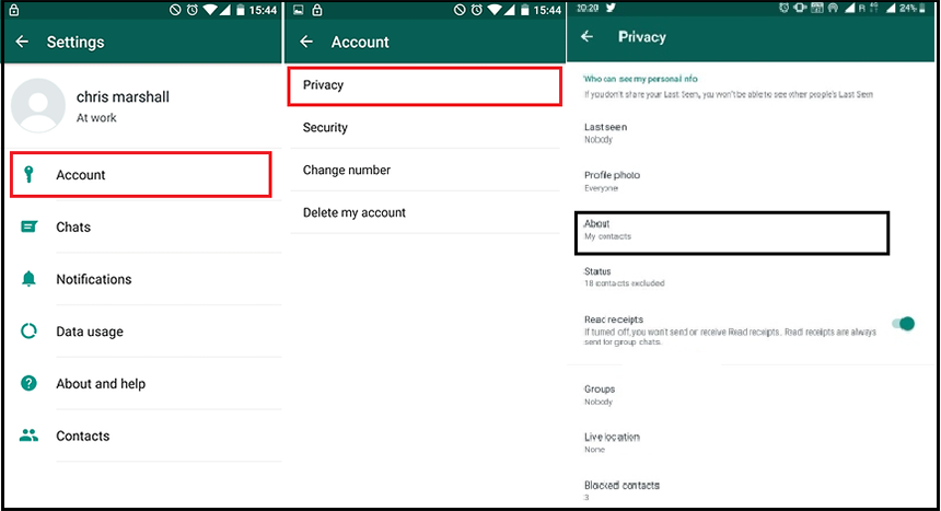برای پنهان کردن شماره تلفن در واتساپ کاربران باید پس از ورود به برنامه بخش تنظیمات را باز کنند و به قسمت حساب کاربری یا همان Account مراجعه کنند. از بین گزینههای نمایان شده، افراد باید بخش حریم خصوصی و یا Privacy را انتخاب کرده و به قسمت مورد نیاز وارد شوند. در این بخش کاربر شاهد گزینه About یا "درباره" است که باید آن را انتخاب کنند.
